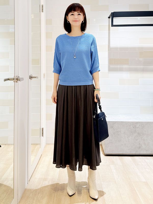 以深色外層襯衫呼應淡色系裙裝打造俐落又柔和的對比層次內搭印花上衣增添休閒氣息而帶有打褶線條的長裙則展現優雅律動整體以淡藍與白色為基調營造清新又帶點都會感的穿搭氛圍適合初秋輕盈出行