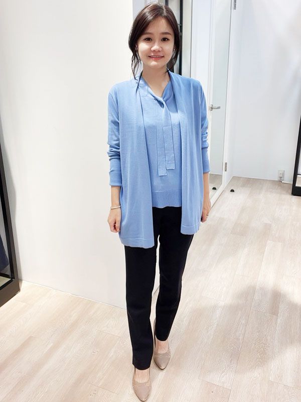 清新的藍色調上衣以蝴蝶結細節增添柔美氣息展現優雅又不失俐落的風格下身搭配大格紋長裙透過規律線條營造出層次與份量感讓造型更顯沉穩大方搭配尖頭鞋款修飾比例整體散發知性與甜美並存的氛圍無論日常通勤或休閒聚會都能輕鬆駕馭