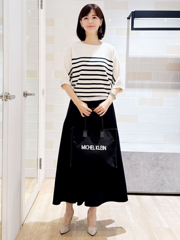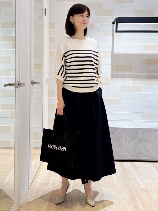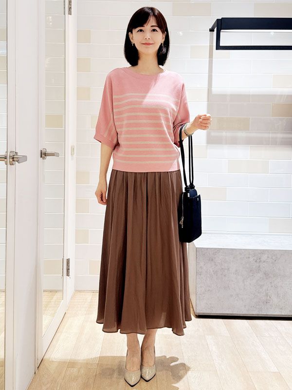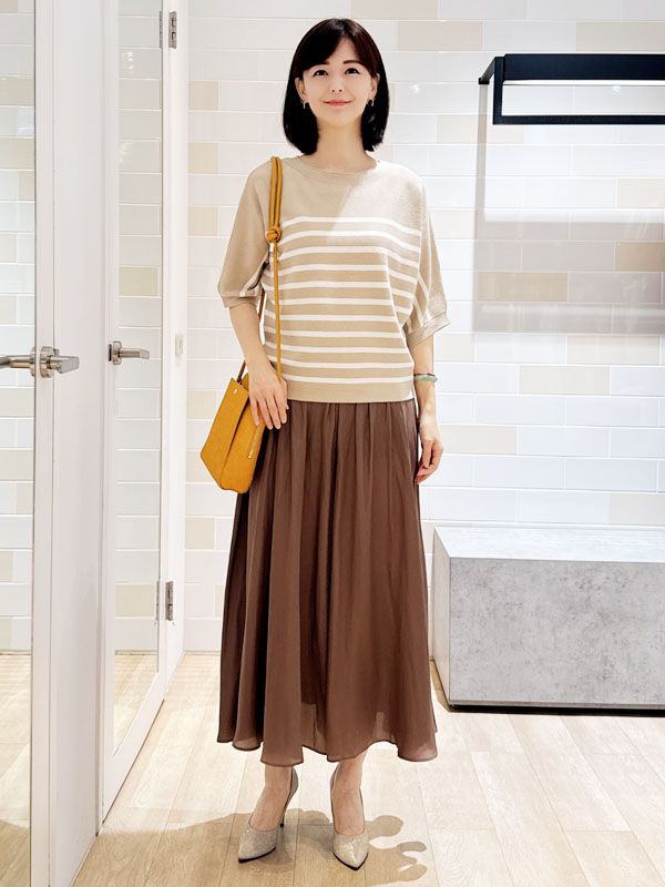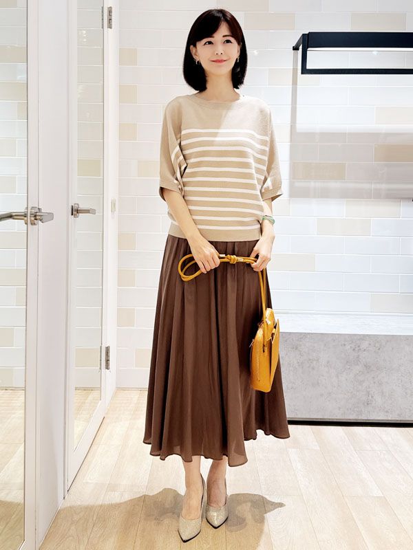 下身搭配帶有光澤感的寬褲裙 隨步伐自然流動 增添輕盈的女性魅力