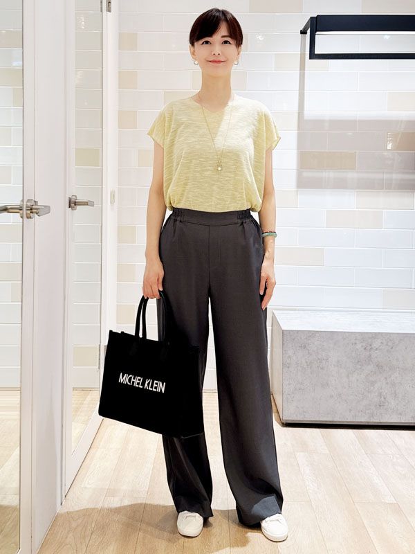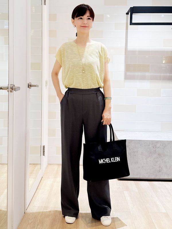 以柔和的淡黃調上衣搭配俐落黑色寬褲呈現明亮又穩重的對比感微光澤的針織質地增添細緻層次簡約剪裁襯托自然優雅氣質搭配亮色手袋與尖頭鞋讓整體造型更顯洗鍊散發輕盈而知性的都會風格