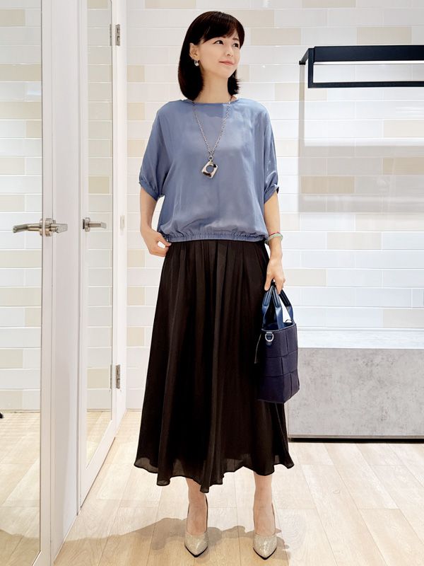 柔和的藍色上衣以緞面光澤映襯肌膚展現優雅氣質下身搭配輕盈的黑色寬褲裙行走間流露自然飄逸感整體造型以簡約配色營造高雅印象適合通勤、約會等多種場合輕鬆展現知性與柔美並存的風格
