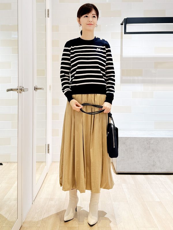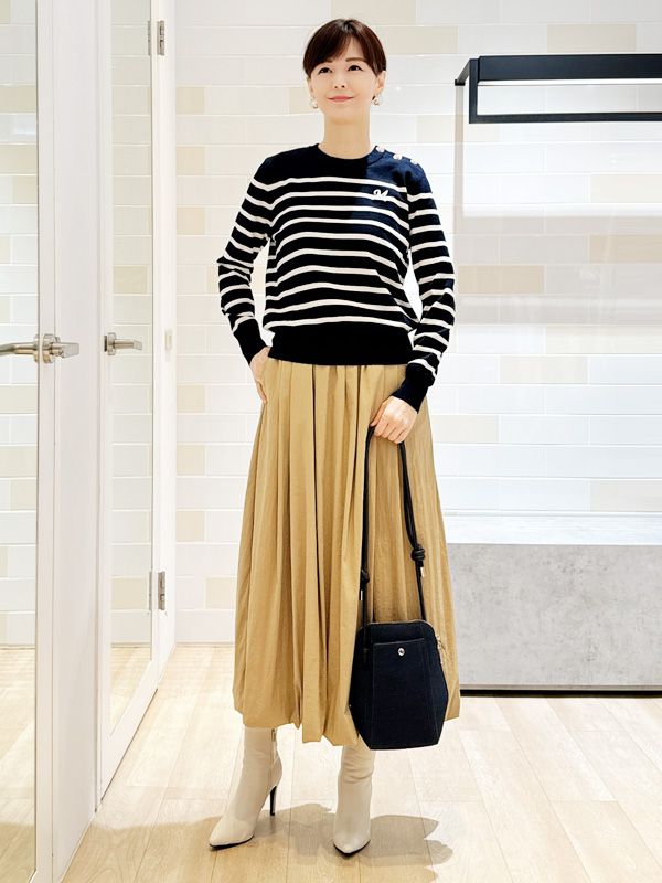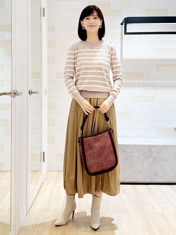 柔和的條紋針織上衣散發法式休閒氣息下身以立體澎度的長裙增添份量感與飄逸氛圍整體以溫潤的大地色調呈現舒適自然的協調感搭配高筒靴與酒紅包款點綴平衡出優雅與個性兼具的初秋穿搭