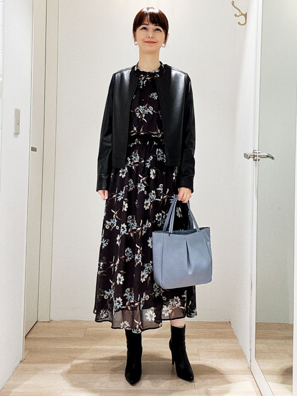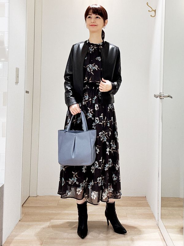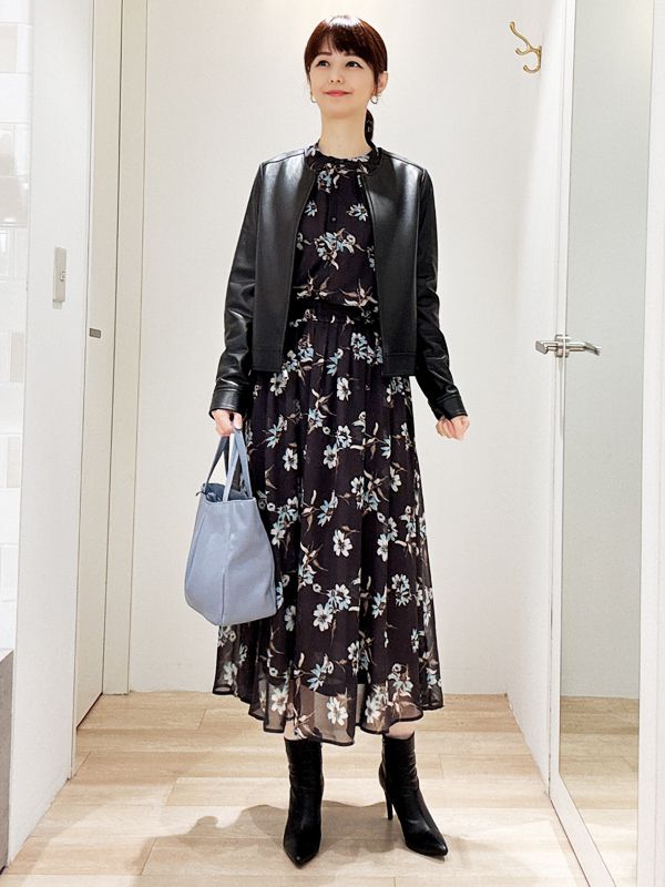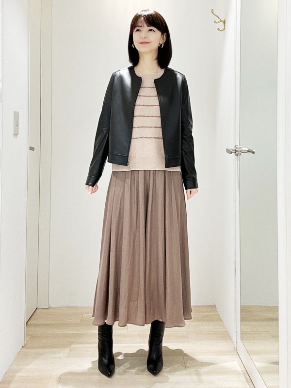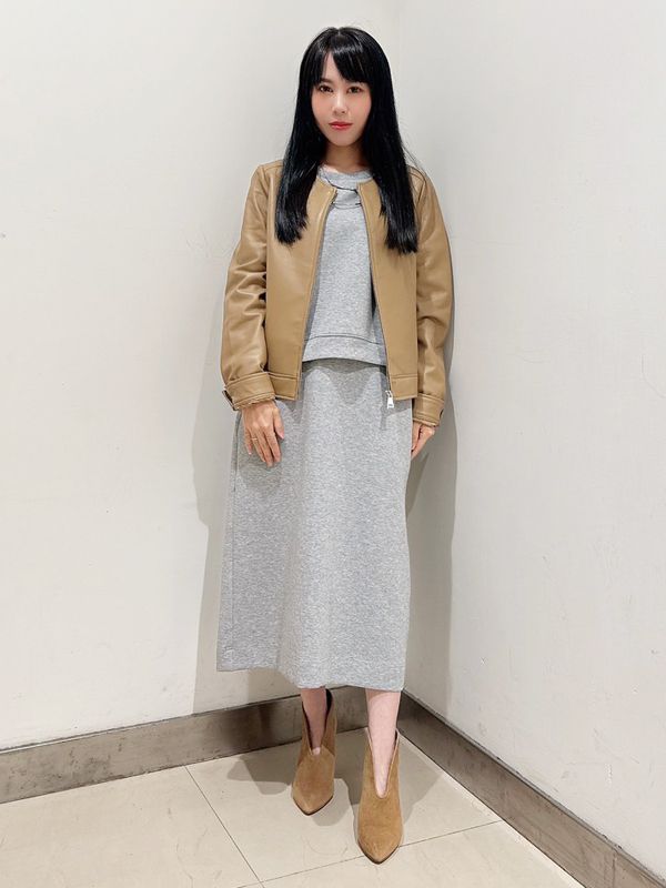 以俐落的皮質短外套為造型重點搭配柔和色調的針織上衣與光澤感裙裝展現剛柔並濟的高雅氛圍柔順的垂墜材質隨步伐搖曳為整體注入輕盈感黑色短靴則平衡甜美氣息增添洗鍊魅力