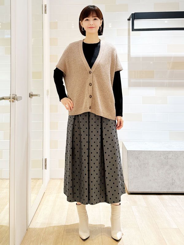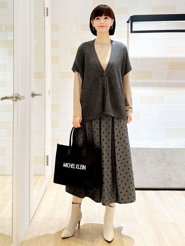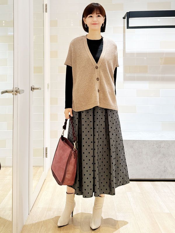 下身選用帶有植絨圓點的壓褶裙