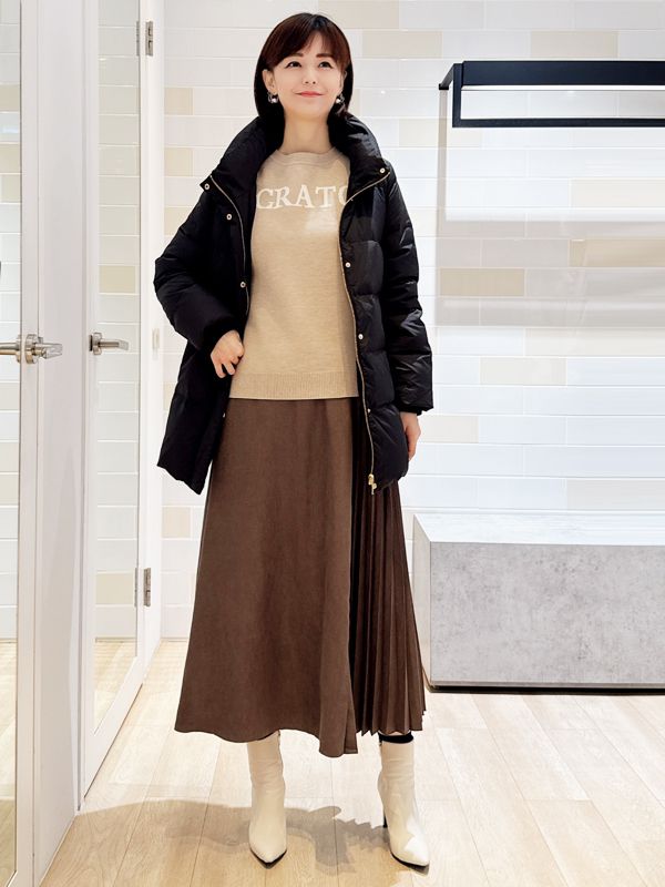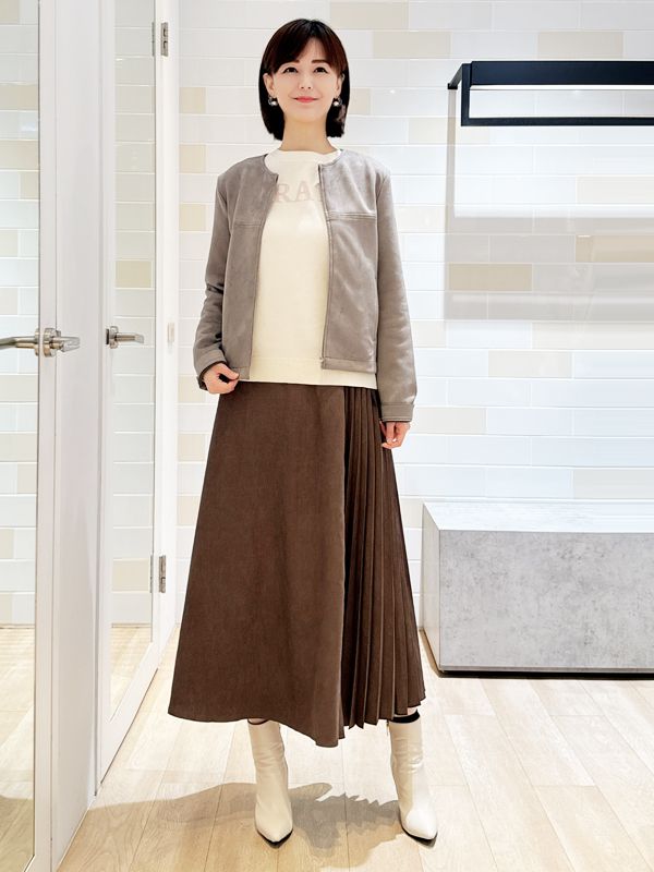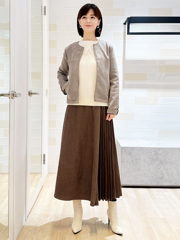 下身選擇細緻霧感材質與不對稱摺線設計 隨步伐展現優雅律動 搭配短靴勾勒修長比例 呈現兼具保暖與都會感的冬日穿搭