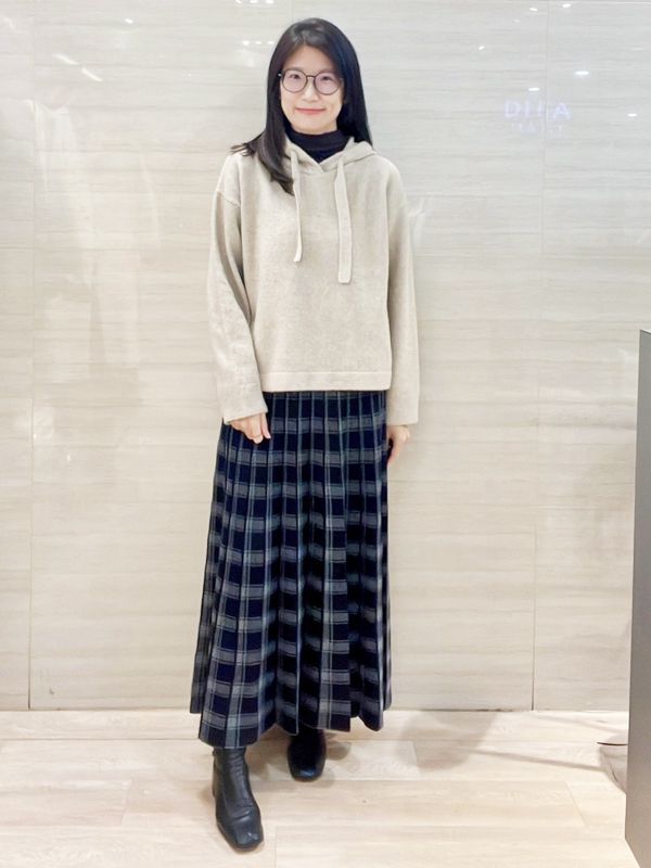 下身選擇格紋百褶線條 隨步伐自然擺動 平衡整體份量感 搭配短靴更顯俐落 展現實穿與風格兼具的日常穿搭