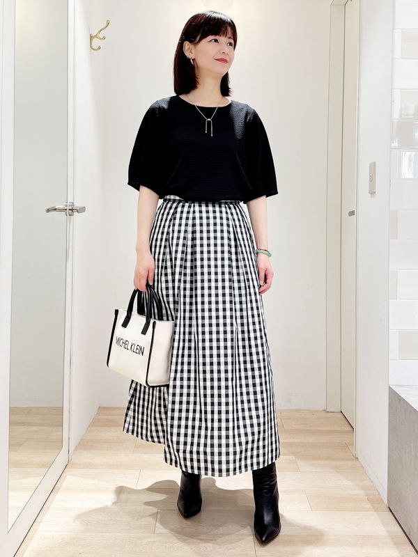 以細緻立體紋理營造低調層次感簡約輪廓勾勒俐落上身比例下身選擇格紋打褶設計隨步伐自然展開展現優雅份量與復古氣息黑白對比清晰分明整體在沉穩中帶有亮點無論日常通勤或週末出遊皆能展現知性品味