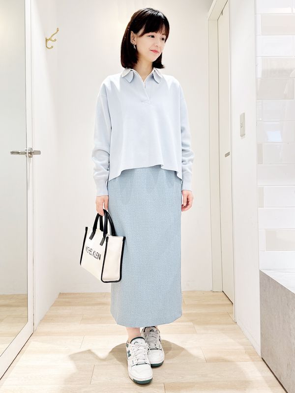 以柔和淺藍調營造清新氣息寬鬆上身透過翻領設計增添休閒層次內搭白色襯衫自然露出下襬拉出輕盈堆疊感下身選擇立體紋理窄裙修飾身形比例,同時展現優雅線條搭配球鞋平衡甜美氛圍呈現舒適又不失質感的日常造型