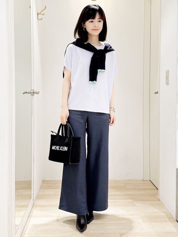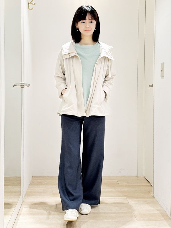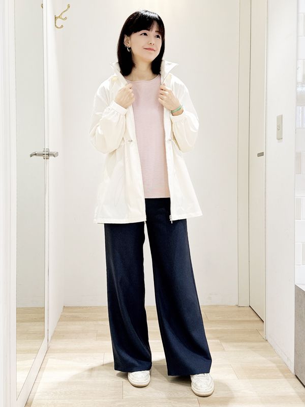 下身選擇俐落直筒長褲 修飾腿部線條 同時保有自在活動感