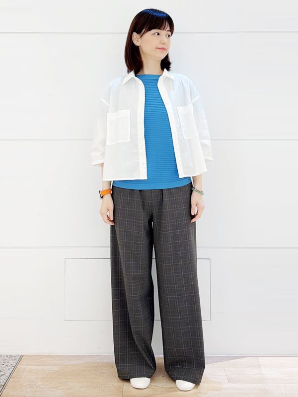 下身搭配格紋寬褲 增添都會感與造型變化 兼具休閒與質感的日常風格